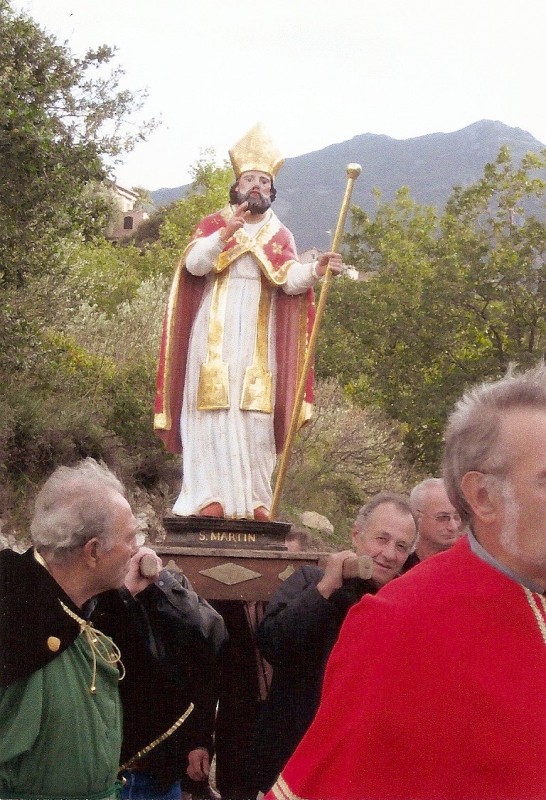 Saint Martin descend de la montagne vers cette vallée bénie. Là les habitants, honnêtes travailleurs, offrent l’hospitalité au saint. La sécheresse qui sévissait depuis plusieurs mois n’avait pas permis la constitution de grandes réserves, et pourtant du vin, des fruits secs, du pain étaient servis quotidiennement à Martinu. Pour ne rien arranger les chenilles causaient de gros dégâts dans les vergers et potagers du village. Malgré cela, les généreux habitants continuaient de traiter Martinu de leur mieux. Saint Martin touché par la bonté et la foi de ces gens, leur dit alors: « Nous allons tous prier et nous ferons une procession à travers vos champs. Dieu vous viendra en aide ». Du plus jeune au plus ancien, ils partent tous en procession dans les rues et les champs du village. La pluie tant espérée ne se fait pas attendre. Les chenilles ont disparues. Les habitants suite à ces miracles feront de Martinu le saint patron de Patrimonio. C’est pourquoi tous les ans en novembre, les villageois fêtent dignement San Martinu autour d’un buffet en donnant avec joie l’hospitalité aux gens de passage.