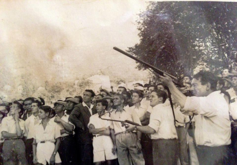 Retour de la chasse : Devant la maison Giovannetti au hameau Palazzo, les chasseurs et leurs chiens prennent la pose avec le gibier du jour. On reconnaît sur cette photo : Gilormini Pierre-Paul (dit Bourvil), Fratacci Pierre-Antoine (U Vescu), Giovannetti Nonce, Fratacci Dominique, Calvelli Pierre, Gilormini Antoine, Giovannetti Pierrot, Marfisi Marius, Andreani Jean...